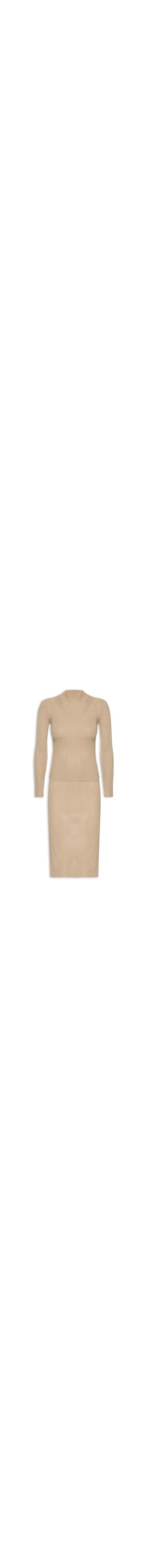 O conjunto marrom contém 2 peças sendo 1 saia e 1 casaco confeccionados em tricot com superfície canelada, fios de lurex e alta elasticidade. A blusa justa ao corpo possui gola alta e mangas longas. A saia justa ao corpo possui cintura alta, cós com elástico embutido, fenda posterior e comprimento midi.