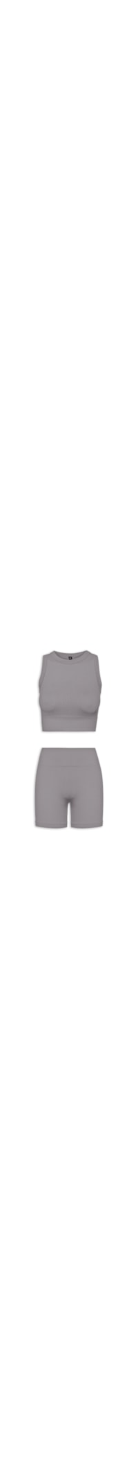 O conjunto bege é confeccionado em malha canelada justa com alta elasticidade. A regata possui decote redondo, alças médias, cavas regulares, sem bojo e comprimento cropped*. O short possui cintura alta e cós amplo.