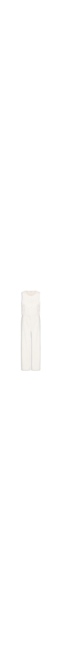 O conjunto bege é confeccionado em tecido leve sem elasticidade. O colete justo ao corpo possui decote redondo, cavas regulares, pences na altura do busto, padronagem de listras em cor contrastante, forro e fechamento frontal por botões. A calça solta ao corpo possui cintura alta, cós com passantes, bolsos frontais modelo faca, pences posteriores, padronagem de listras em cor contrastante, comprimento longo e fechamento frontal por zíper e botão.