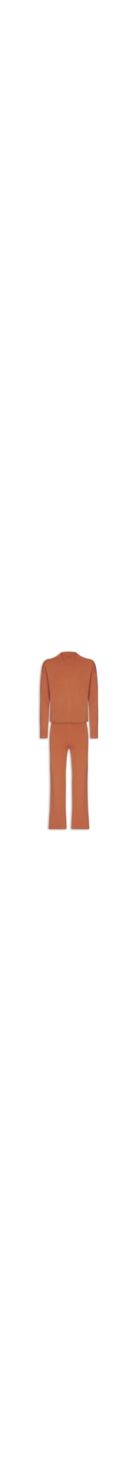 O conjunto marrom é confeccionado em tricot com alta elasticidade. A blusa solta ao corpo, possui gola alta, ombros estendidos e mangas longas. A calça solta ao corpo, possui cintura alta, cós com elástico embutido, bolsos frontais de modelo faca e comprimento longo.