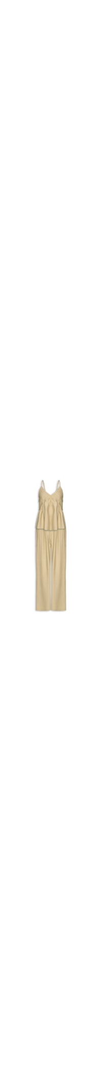 O conjunto bege é confeccionado em malha leve com toque de linho e sem elasticidade. A regata possui decote V, alças finas reguláveis, cavas regulares, pregas e recortes com efeito franzido no busto. A calça reta possui cintura baixa, cós com elástico embutido na parte posterior, bolsos frontais embutidos, pregas frontais e comprimento longo.