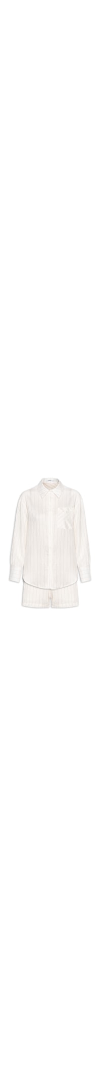 O conjunto off white é confeccionado em tecido leve com toque de linho e sem elasticidade. A camisa solta ao corpo possui colarinho clássico, mangas curtas, barra arredondada, padronagem de listras e fechamento frontal por botões. A bermuda possui cintura alta, cós reto, bolsos frontais modelo faca, forro, padronagem de listras na e fechamento por botão e zíper.