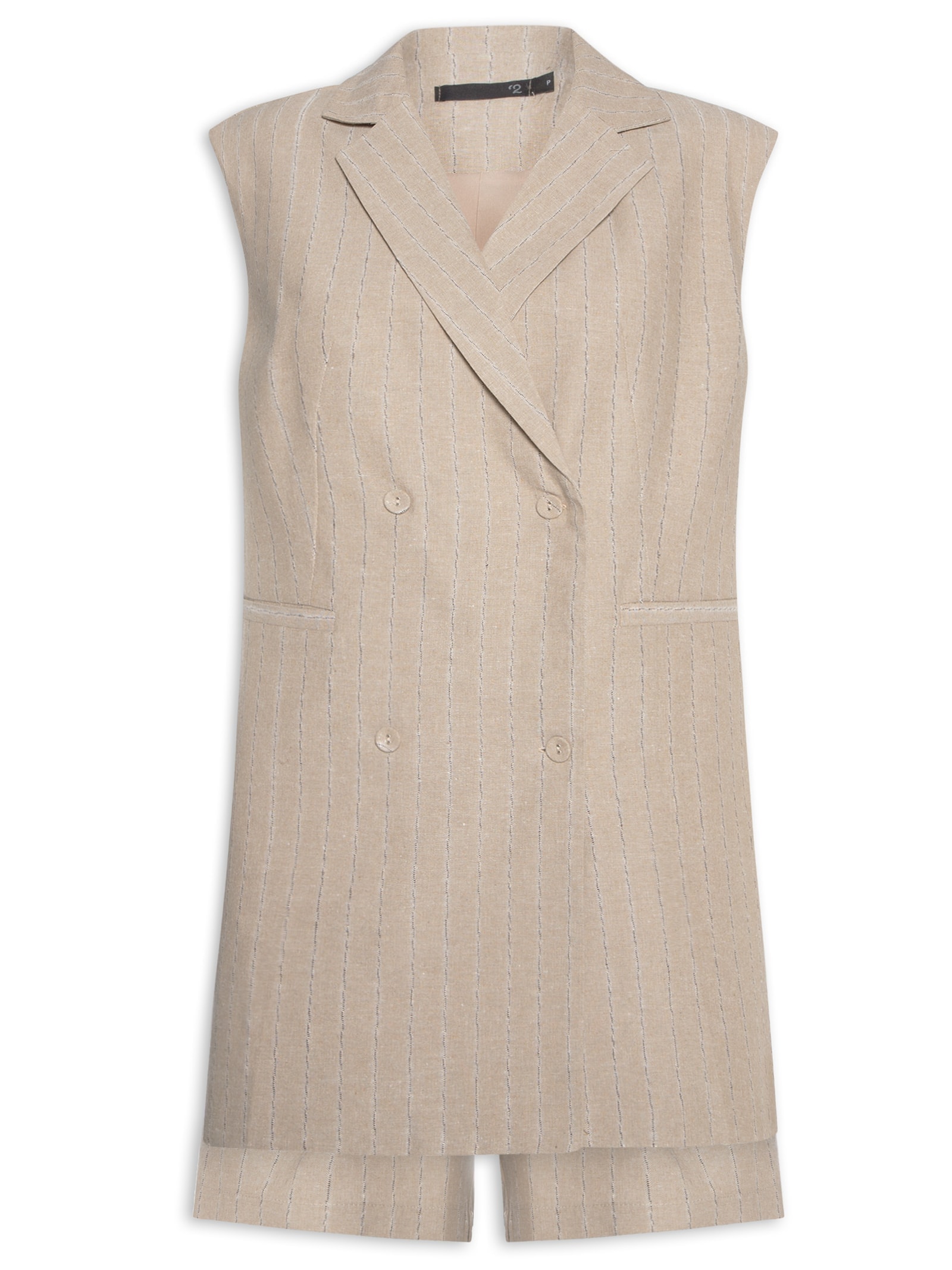 O conjunto bege é confeccionado em tecido leve sem elasticidade. O colete solto ao corpo de modelo maxi possui lapela chanfrada, alças largas com ombreiras embutidas, recortes frontais, dois bolsos decorativos na parte frontal, padronagem listrada em cor contrastante, forro, e fechamento frontal por botões. O short solto ao corpo possui cintura alta, cós com elástico embutido na parte posterior, dois bolsos laterais, pregas na parte frontal, padronagem listrada em cor contrastante, e comprimento curto. Acompanha cinto de mesmo tecido com espessura média e fivela encapada arredondada para uso opcional.