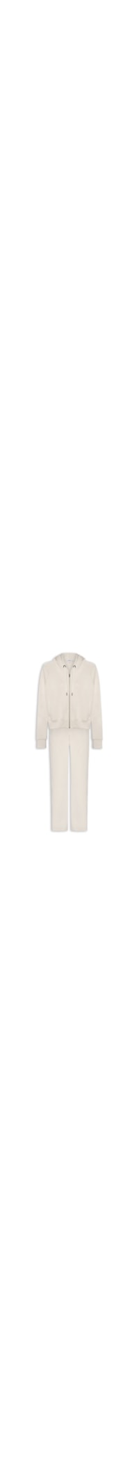 O conjunto bege é confeccionado em moletom com moletom com baixa elasticidade. A jaqueta solta ao corpo possui capuz com codão para ajuste embutido, mangas longas com punhos ajustados, bolsos frontais modelo faca, fendas laterais com ajuste por botões e fechamento frontal por zíper. A calça solta ao corpo possui cintura alta, cós elástico, bolsos frontais modelo faca, fendas laterais com ajuste por botões e comprimento longo.