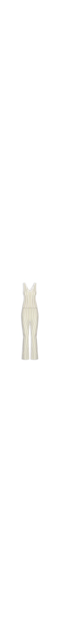 O conjunto verde é confeccionado em tricot com alta elasticidade. A regata justa ao corpo possui decote V, alças médias, padronagem listrada em cores contrastantes e cavas regulares. A calça solta ao corpo possui cintura alta, cós com elástico embutido, padronagem listrada em cores contrastantes e comprimento longo.