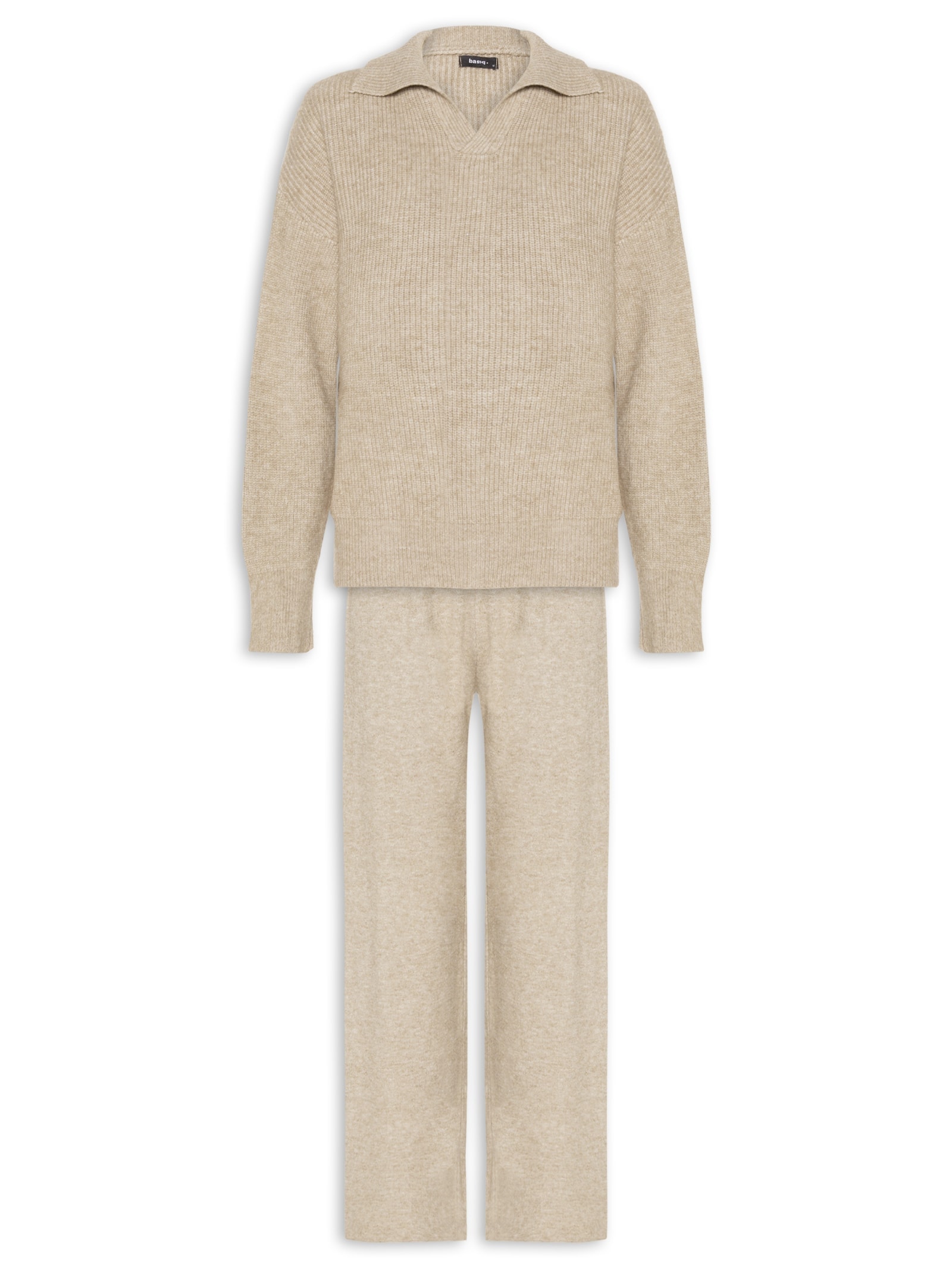 O conjunto bege é confeccionado em tricot com superfície canelada com baixa elasticidade. A blusa solta ao corpo, possui colarinho alongado, ombros estendidos e mangas longas com ajuste nos punhos. A calça solta ao corpo, possui cintura alta, cós com elástico embutido e comprimento longo.
