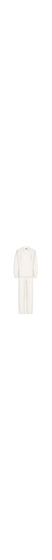 O conjunto off white é confeccionado em tricot com superfície canelada com baixa elasticidade. A blusa solta ao corpo, possui colarinho alongado, ombros estendidos e mangas longas com ajuste nos punhos. A calça solta ao corpo, possui cintura alta, cós com elástico embutido e comprimento longo.