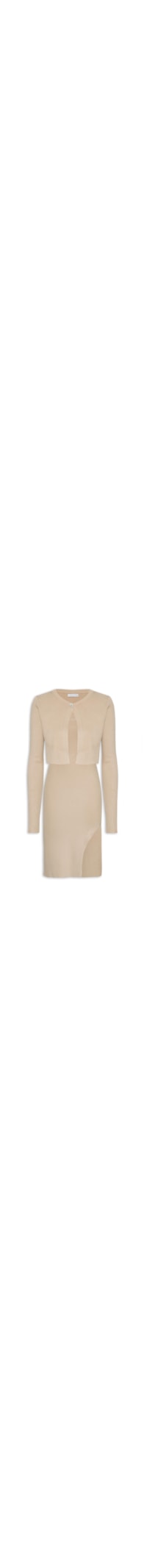 O conjunto bege contém 2 peças sendo 1 vestido e 1 casaco confeccionado em tricot com superfície canelada e alta elasticidade. O vestido justo ao corpo possui decote U, alças médias, fenda lateral e comprimento midi. O casaco solto ao corpo possui decote redondo, mangas longas, comprimento cropped* e fechamento frontal em botão