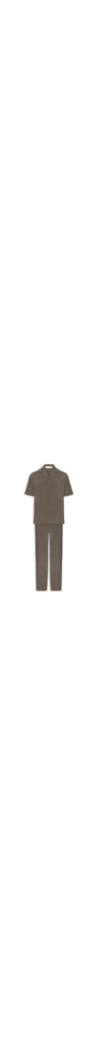 O conjunto marrom é confeccionado em tecido leve sem elasticidade. A camisa solta ao corpo possui colarinho clássico, mangas curtas, bolso embutido na altura do tórax e fechamento frontal por botões. A calça solta ao corpo possui cintura média, cós elástico com cordão embutido para amarração frontal, bolsos frontais modelo faca, bolso posterior embutido e comprimento longo.