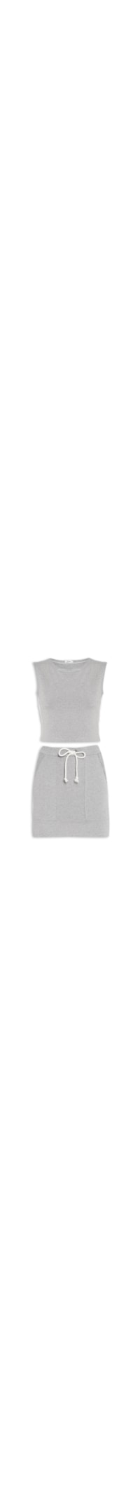 O conjunto cinza é confeccionado em malha. A blusa possui decote redondo, cavas regulares, shape solto, caimento reto e acabamento pespontado. A saia possui cintura alta, cós elástico com cordão para ajuste, bolsos frontais de modelo faca, fenda lateral, forro, shape solto, caimento reto e acabamento pespontado.