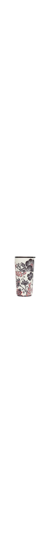 O copo preto é produzido por aço inoxidável. A peça possui formato cilíndrico, tamanho médio, suporte inferior emborrachado com logo da marca em relevo, mix de estampas em cores contrastantes e fechamento superior por tampa hermética.