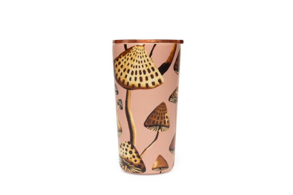 O copo rosa é produzido por aço inoxidável. A peça possui formato cilíndrico, tamanho médio, suporte inferior emborrachado com logo da marca em relevo, mix de estampas em cores contrastantes e fechamento superior por tampa hermética.