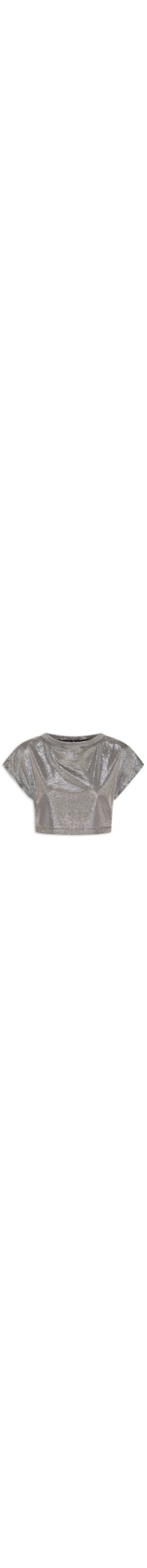O cropped prata é confeccionado em tecido leve com superfície metalizada. A peça possui decote redondo, ombros e cavas estendidas, aplicação de tag metálica na região posterior do decote, comprimento cropped*, shape solto e caimento reto.