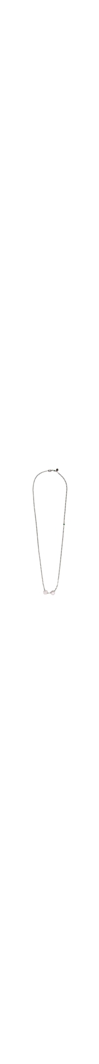 O escapulário cinza é produzido em latão. A peça possui corrente fina com elos alongados e duas medalhas redondas com relevos religiosos, unidas por um elo central e fechamento posterior por fecho lagosta.