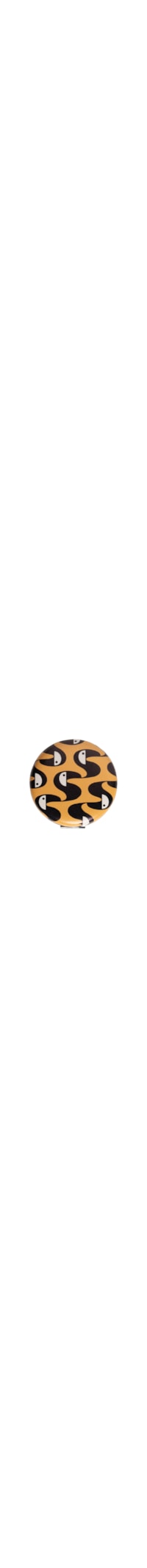 O espelho Amarelo é produzido em metal. A peça possui tamanho pequeno, formato arredondado, abertura interna com espelho aplicado nas duas faces e mix de estampas em cores contrastantes na parte externa.