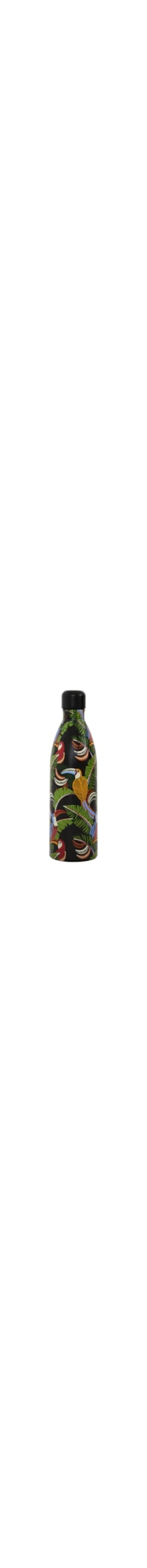 A garrafa preta é produzida em aço inoxidável. A peça possui superfície lisa com estampa tropical de folhagens e tucanos em cores contrastantes, formato cilíndrico com leve curvatura, capacidade de 1 litro, acabamento fosco, fechamento superior por tampa rosqueável em cor contrastante.