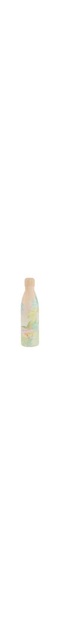 A garrafa amarela é produzida em aço inoxidável. A peça possui formato cilíndrico, tamanho grande, mix de estampas em cores contrastantes, suporte inferior emborrachado e fechamento superior por tampa hermética.