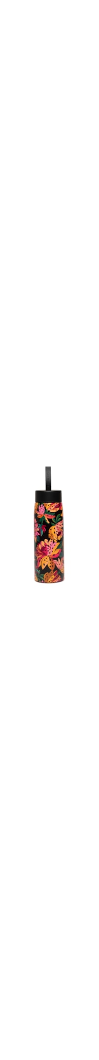 A garrafa preta é produzida em aço inoxidável. A peça possui tamanho pequeno, estampa figurativa de bananas em cores contrastantes, suporte inferior emborrachado e fechamento superior por tampa hermética com puxador em borracha com detalhe do nome da marca em baixo-relevo.