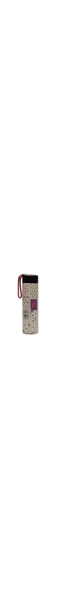 A garrafa bege é produzida em aço inox. A peça possui formato cilíndrico, estampa figurativa de cartas em cores contrastantes, fechamento superior por tampa rosqueável com alça de silicone aplicada e base reta para apoio. Acompanha infusor.