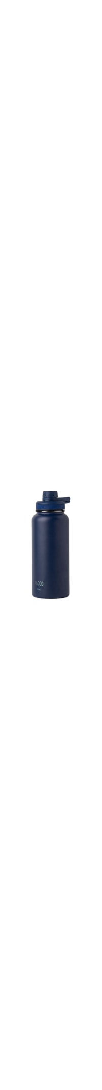A garrafa azul marinho é produzida em aço inox. A peça possui formato cilíndrico, tamanho médio, paredes duplas com vácuo, nome da marca aplicado na parte frontal, alça rígida e fechamento por tampa hermética de rosca com bico de rosca hermético aplicado.