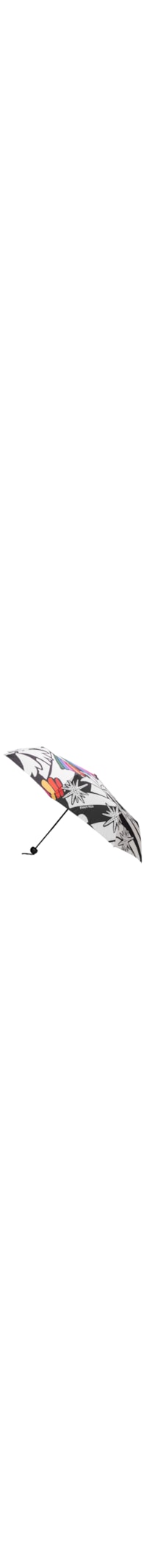 O guarda-chuva preto é produzido em nylon 70. A peça possui armação em metal, alça de fechamento com etiqueta de couro, acionamento manual, aplicação inferior de cordão para apoio, mix de estampas em cores contrastantes e acabamento pespontado.