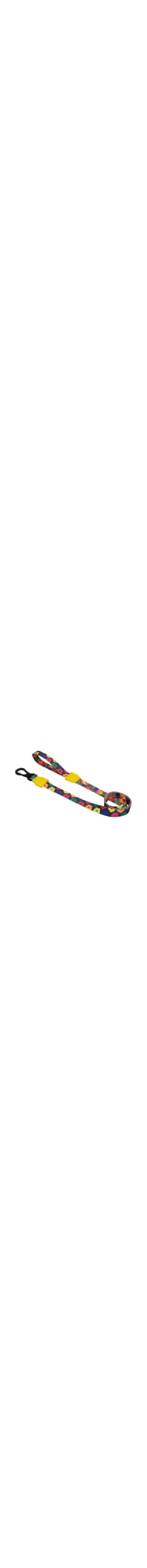 A guia azul é produzida em corda. A peça possui comprimento alongado, faixa emborrachada para sustentação, mix de estampas em cores contrastantes e fechamento por gancho de liga de zinco com fecho de pressão.