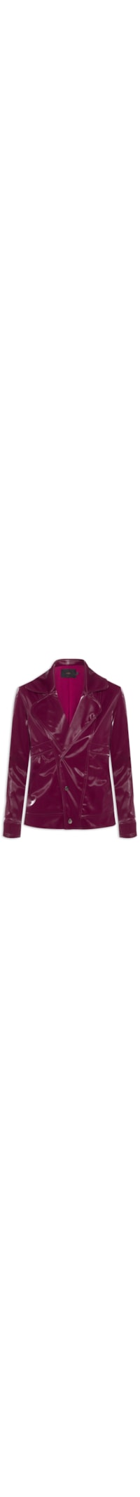 A jaqueta vinho é confeccionada em material sintético com superfície envernizada sem elasticidade. A peça solta ao corpo possui lapela chanfrada, mangas longas, recortes frontais e posteriores, bolsos frontais, forro e fechamento frontal por botões de pressão.