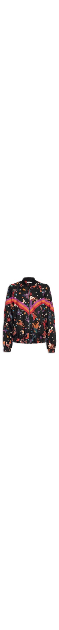 A jaqueta preta é confeccionada em tecido leve sem elasticidade. A peça solta ao corpo possui gola alta com acabamento canelado, manga raglan de comprimento longo com elástico embutido nos punhos, recorte de listras sobreposto em tons contrastantes, mix de estampas figurativas em tons contrastantes, forro e fechamento frontal em zíper.