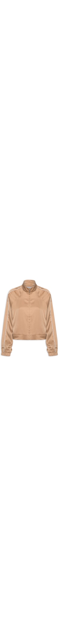 A jaqueta bege é confeccionada em tactel com superfície acetinada sem elasticidade. A peça solta ao corpo possui gola alta, mangas longas modelo raglan com ajuste nos punhos e vivo branco, bolsos frontais embutidos, elástico embutido na barra na parte posterior e fechamento frontal por zíper.