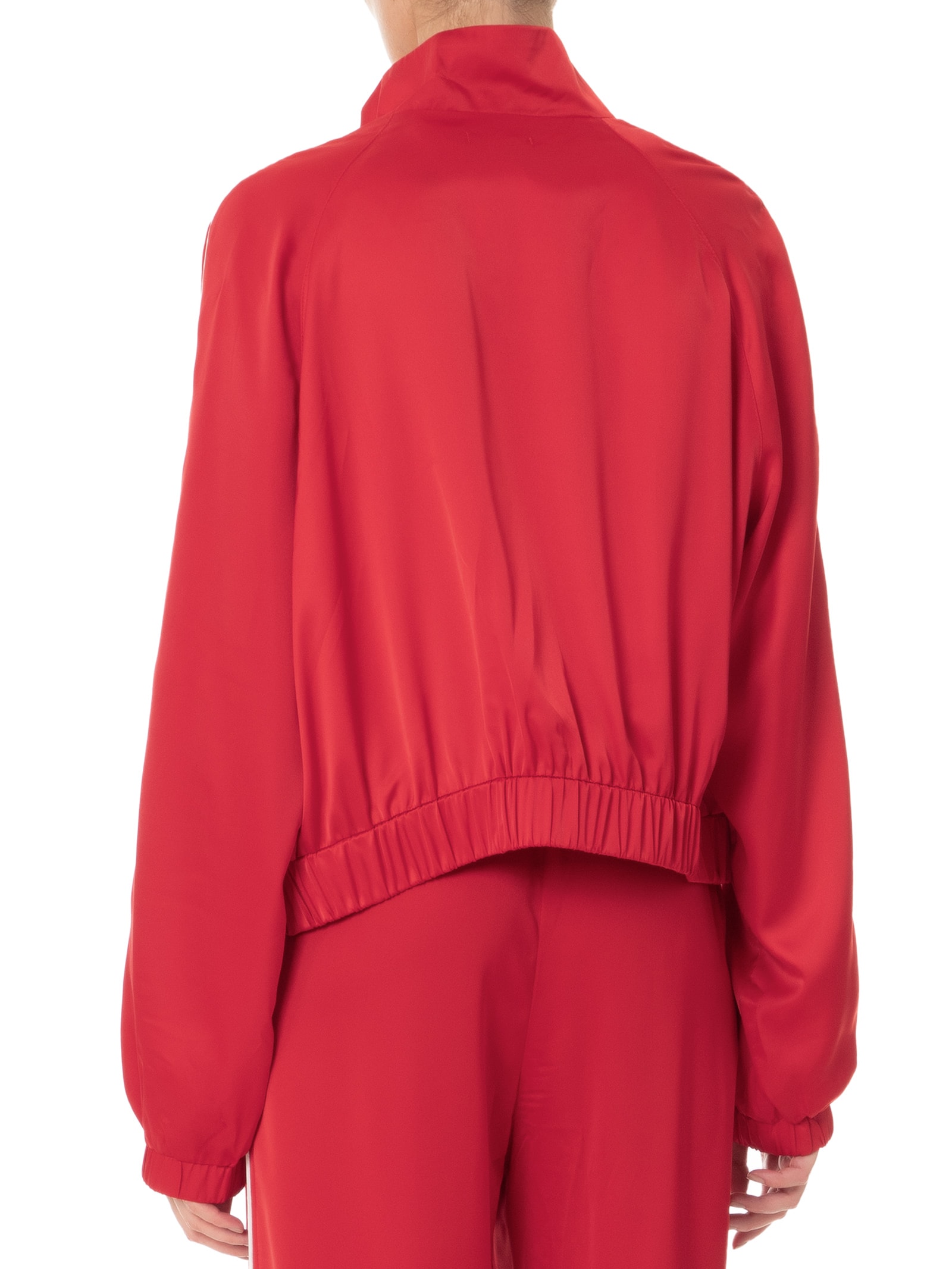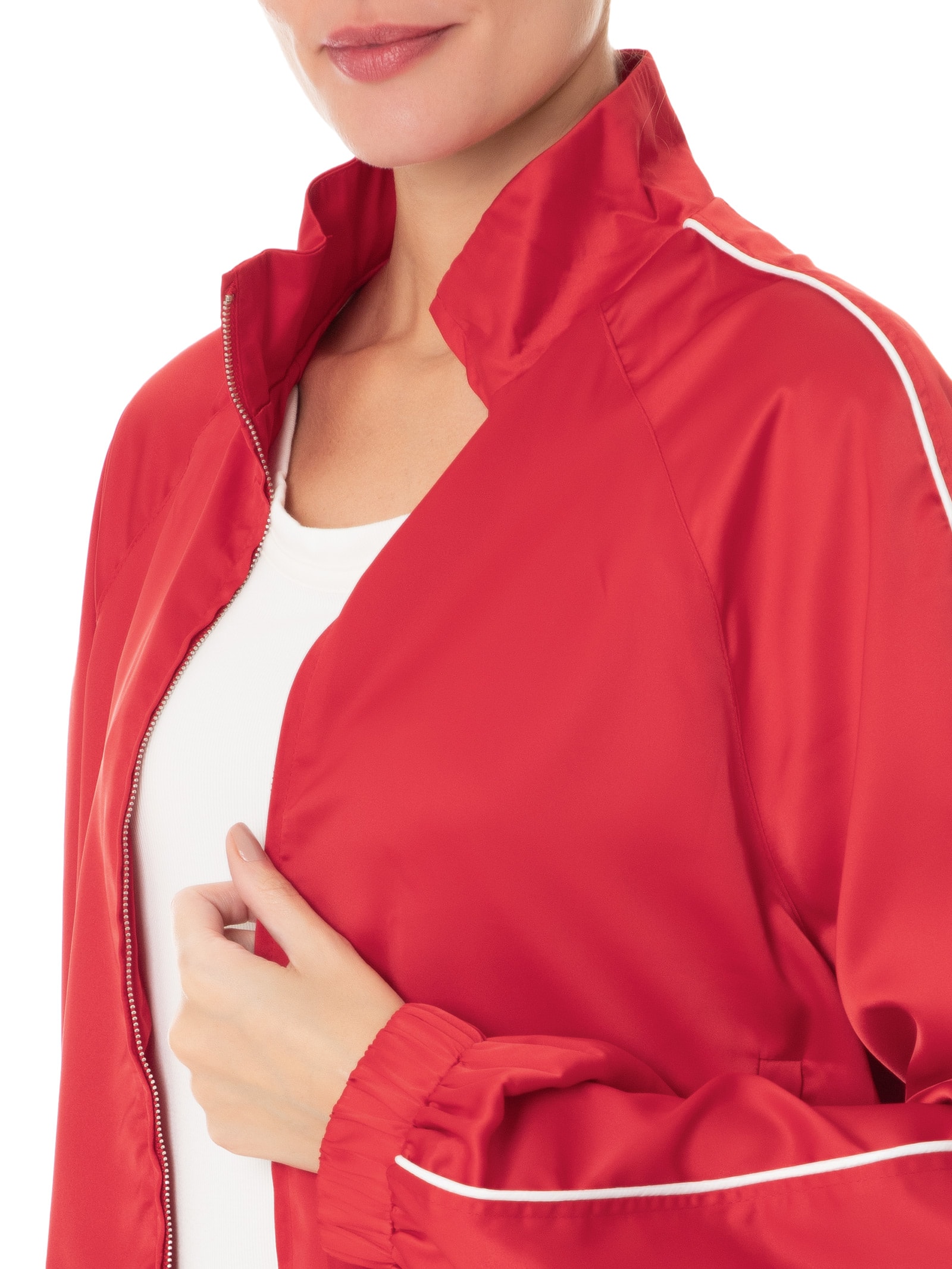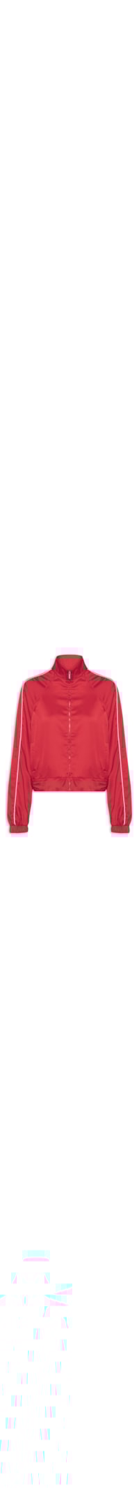 A jaqueta vermelha é confeccionada em tactel com superfície acetinada sem elasticidade. A peça solta ao corpo possui gola alta, mangas longas modelo raglan com ajuste nos punhos e vivo branco, bolsos frontais embutidos, elástico embutido na barra na parte posterior e fechamento frontal por zíper.