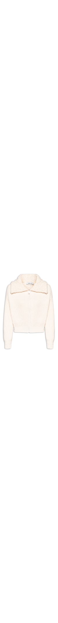 A jaqueta bege é confeccionada em tricot encorpado com superfície canelada sem elasticidade. A peça solta ao corpo possui colarinho maxi em sherpa, mangas longas com ajuste nos punhos, ombros estendidos e fechamento frontal por zíper.