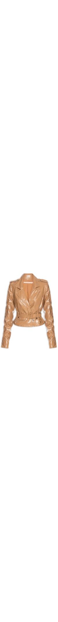 A jaqueta bege é confeccionada em material sintético com superfície texturizada e sem elasticidade. A peça solta ao corpo possui lapela chanfrada, mangas longas com ajuste nos punhos, recortes posteriores, passantes aplicados na parte posterior e frontal na cintura, martingale aplicado nos ombros, ombros frontais decorativos e fechamento frontal por zíper. Acompanha cinto da mesma cor e tecido para uso opcional.