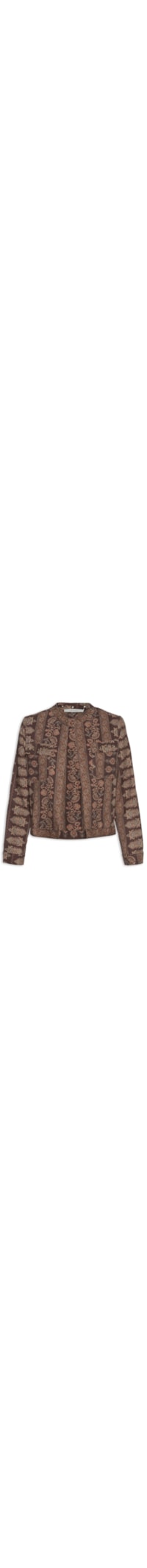 A jaqueta marrom é confeccionada em tecido leve com toque de linho sem elasticidade. A peça solta ao corpo possui decote redondo, mangas longas com abotoamento nos punhos, mix de estampas em cores contrastantes, bolsos frontais com fechamento por aba, ilhoses nos bolsos e no decote e não possui fechamento.