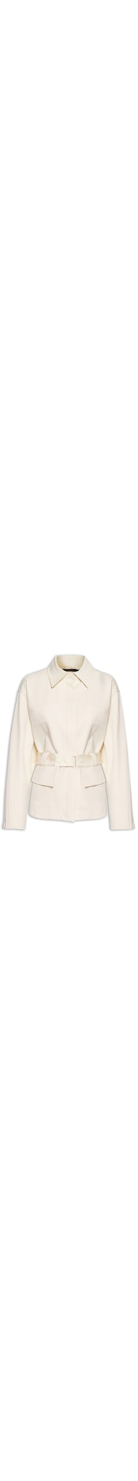 A jaqueta bege é confeccionada em sarja sem elasticidade. A peça solta ao corpo possui colarinho simples, mangas longas com abotoamento nos punhos, recorte nas partes posterior e frontal, recorte com passantes aplicados na altura da cintura, bolsos decorativos na altura do busto, forro, bolsos frontais embutidos com fechamento por aba e fechamento frontal por zíper.