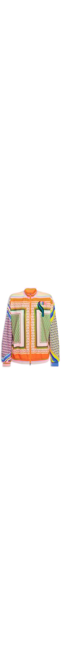 A jaqueta laranja é confeccionada em malha. A peça possui gola alta, mangas longas, ombros estendidos, bordado frontal e posterior em cores contrastantes, mix de estampas em cores contrastantes, shape solto, caimento reto, acabamento canelado e fechamento frontal por zíper bidirecional.