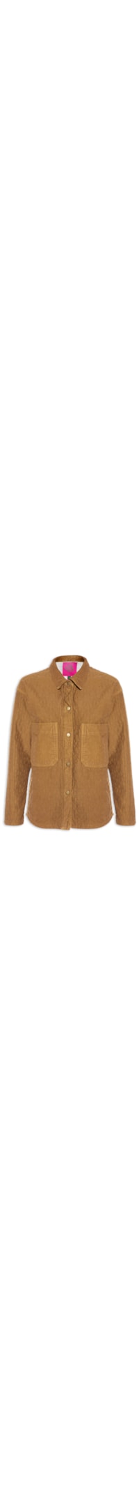 A jaqueta marrom é confeccionada em tecido encorpado com detalhes pespontado. A peça possui colarinho simples, mangas longas bolsos frontais aplicados na altura do tórax, shape solto e fechamento frontal por botões de pressão.