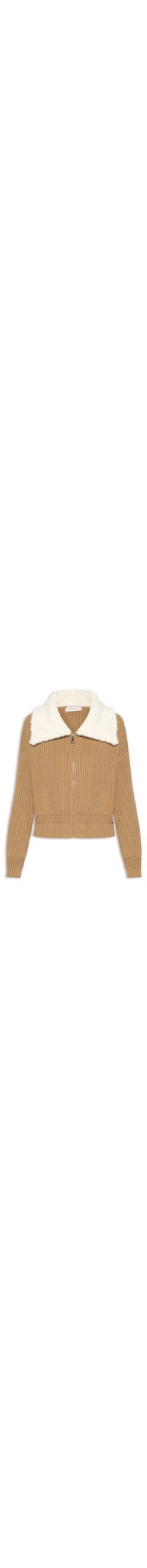 A jaqueta marrom é confeccionada tricot com superfície canelada. A peça solta ao corpo possui maxi colarinho com texturização em pelúcia na cor contrastante off white, ombros estendidos, mangas longas, recorte com detalhes na altura da cintura, acabamento canelado na barra e nos punhos, tag da marca na lateral próximo a barra e comprimento longo.
