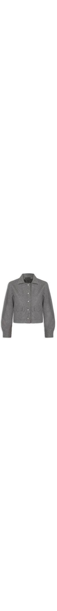 A jaqueta cinza é confeccionada em tecido encorpado com superfície texturizada e sem elasticidade. A peça solta ao corpo possui colarinho clássico, mangas longas, forro, bolsos frontais com aba sobreposta e fechamento por botão de pressão, recortes posteriores, comprimento cropped* e fechamento frontal por botões de pressão.
