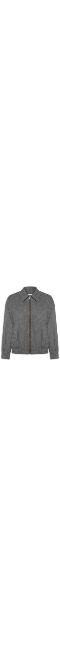 A jaqueta cinza é confeccionada em tecido levemente encorpado sem elasticidade. A peça solta ao corpo possui gola clássica, mangas longas com punhos ajustados, ombros levemente deslocados, bolsos frontais modelo faca, barra com elástico embutido, forro e fechamento frontal por zíper.