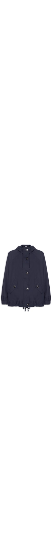A jaqueta azul é confeccionada por tecido leve sem elasticidade. A peça solta ao corpo possui capuz com cordão embutido para ajuste, mangas longas com elástico nos punhos, ombros levemente estendidos, bolsos frontais com fechamento por botões, fendas laterais com botões aplicados para fechamento, cordão embutido na barra para regulagem, forro e fechamento por botão e zíper frontal.