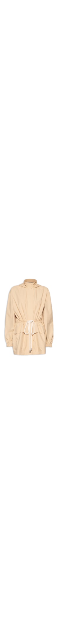A jaqueta bege é confeccionada em tecido rígido sem elasticidade. A peça solta ao corpo possui gola alta, capuz embutido, mangas longas com elástico nos punhos, corão com ponteira metálica embutido na cintura para amarração, bolsos frontais com botão de pressão aplicado, comprimento longo e fechamento frontal por zíper metálico e abotoamento na gola.