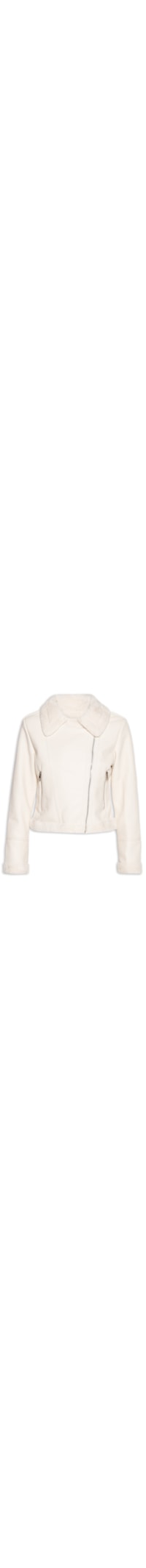 A jaqueta off white é confeccionada em material sintético sem elasticidade. A peça solta ao corpo possui lapela chanfrada, mangas longas, bolsos frontais com fechamento em zíper, recortes posteriores, forro interno e acabamentos em pelúcia e fechamento frontal por zíper.