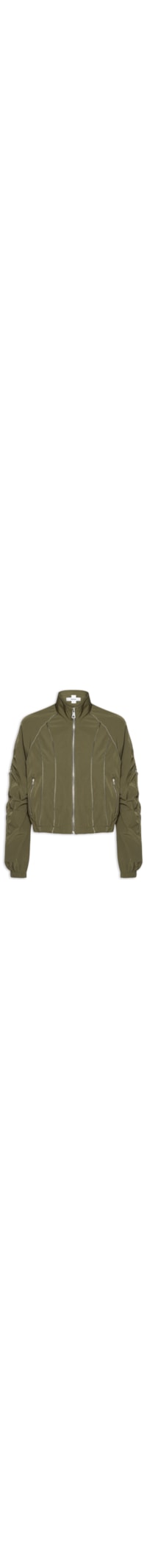 A jaqueta verde é confeccionada em nylon sem elasticidade. A peça solta ao corpo possui gola alta, mangas longas em corte raglan com franzido ao longo da extensão lateral, detalhes na parte externa da manga, recortes na parte frontal, comprimento cropped*, barra franzida com cordão regulável, forro interno e fechamento frontal por zíper.