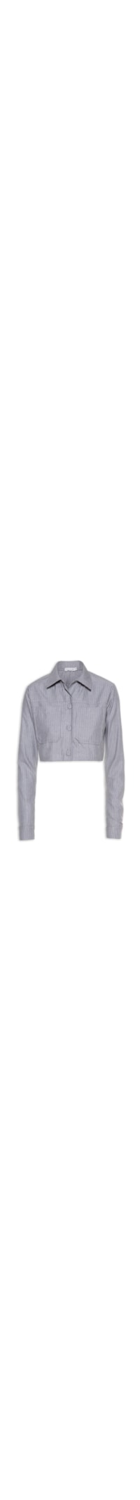 A jaqueta cinza é confeccionada em tecido leve. A peça possui colarinho, decote v, mangas longas com abotoamento nos punhos, bolsos frontais, padronagem de listras em cor contrastante, comprimento cropped*, shape solto, caimento reto, acabamento pespontado e fechamento frontal por botões.
