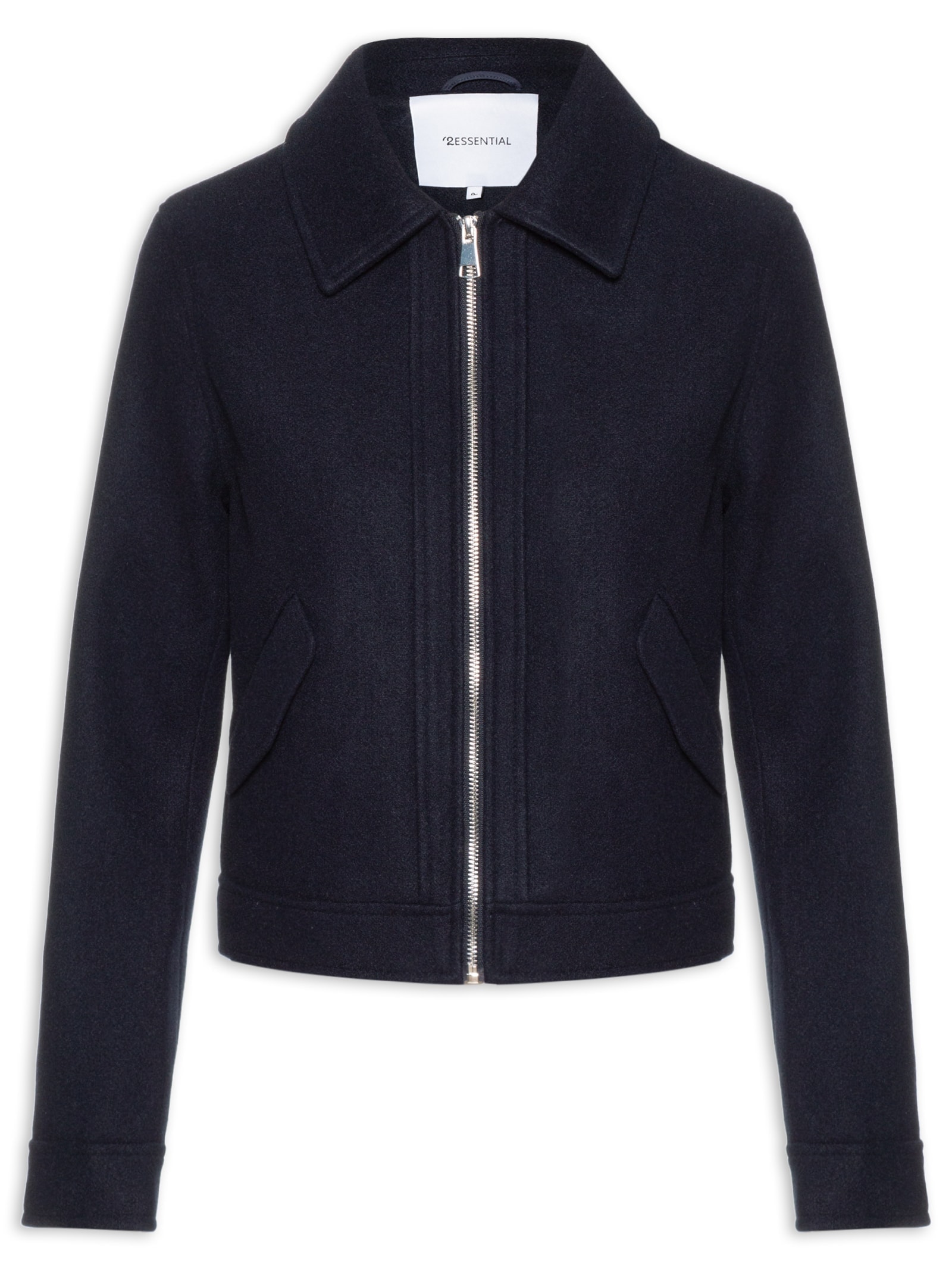 A jaqueta azul marinho é confeccionada em tecido encorpado com baixa elasticidade. A peça solta ao corpo possui colarinho clássico, mangas longas, bolsos frontais embutidos com aba sobreposta, recorte frontais e posteriores, forro e fechamento frontal por zíper.