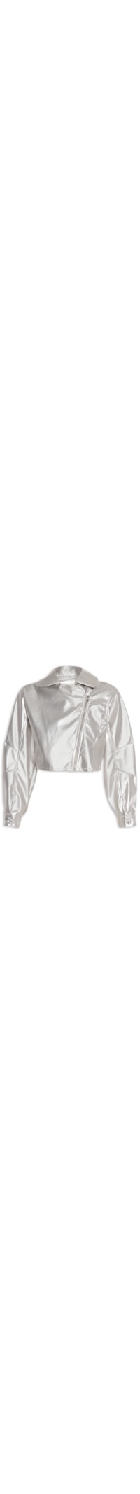 A jaqueta prata é confeccionada em material sintético com superfície metalizada. A possui lapela chanfrada, mangas longas com abotoamento nos punhos e detalhe de pences, recortes frontais e posteriores, tag metálica da marca aplicada na parte posterior do recorte, forro, comprimento cropped**, shape solto e fechamento frontal por zíper.