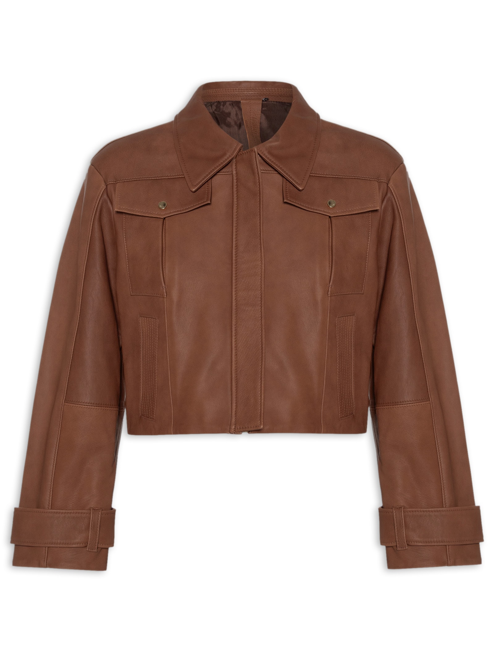 A jaqueta marrom é confeccionada em couro sem elasticidade. A peça solta ao corpo possui colarinho clássico, mangas longas com martingale nos punhos, recortes posteriores e frontais, abas sobrepostas na parte frontal, bolsos frontais embutidos com detalhe de pregas, forro, comprimento cropped* e fechamento frontal por zíper.