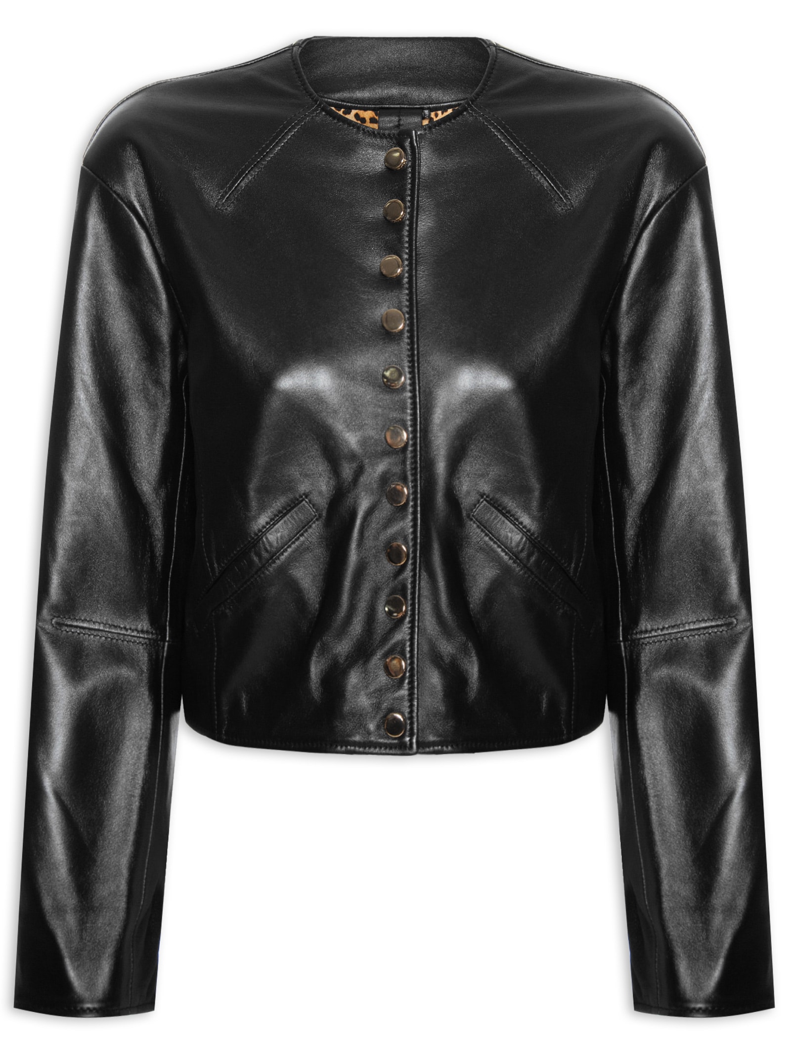 A jaqueta preto é confeccionada em couro sem elasticidade. A peça solta ao corpo possui decote redondo, ombreiras embutidas, mangas longas com fendas de fechamento em zíper, pences frontais, bolsos frontais embutidos, recortes posteriores, forro com estampa animal print em cores contrastantes, e fechamento frontal em botões de pressão.