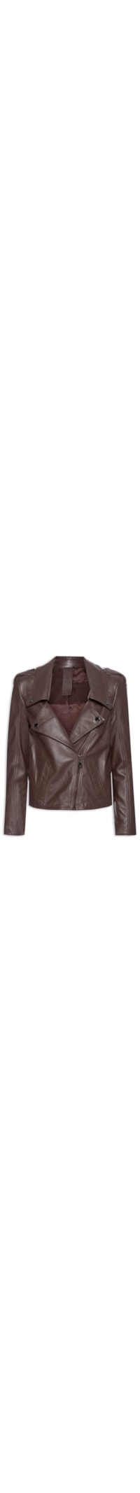 A jaqueta marrom é confeccionada em couro sem elasticidade. A peça solta ao corpo possui maxi lapela chanfrada, ombros com detalhe de tira média sobreposta e botão de pressão, mangas longas com recortes e fenda de fechamento em zíper, recortes frontais e posteriores, bolsos frontais embutidos, recorte posterior sobreposto com aplicação de aviamento forrado, forro e fechamento frontal em zíper.