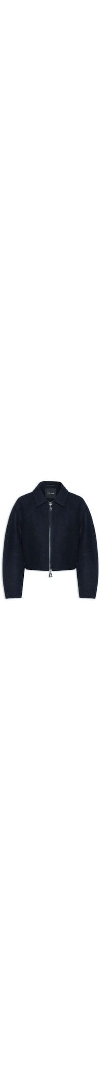 A jaqueta azul é confeccionada em lã batida sem elasticidade. A peça solta ao corpo possui gola simples, ombros estendidos, mangas longas com recortes, pences posteriores, forro e fechamento frontal em zíper duplo bidirecional.
